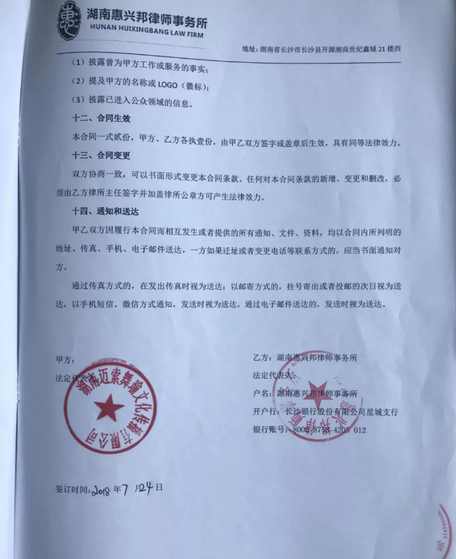 近日,湖南惠興邦律師事務所與湖南邁索舞瑜文化傳播有限公司簽訂《常年法律顧問合同》,由惠興邦為湖南邁索舞瑜文化傳播有限公司提供日常法律咨詢,起草、審查及修改合同,協助參與公司重大經營項目的談判及出具相關法律意見,代理公司訴訟等法律服務。