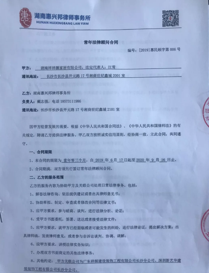 祝賀惠興邦與湖南祥祥源家居有限公司、湖南大道至簡電子商務有限公司、長沙華夏智謀文化有限公司分別簽訂常年法律顧問合同