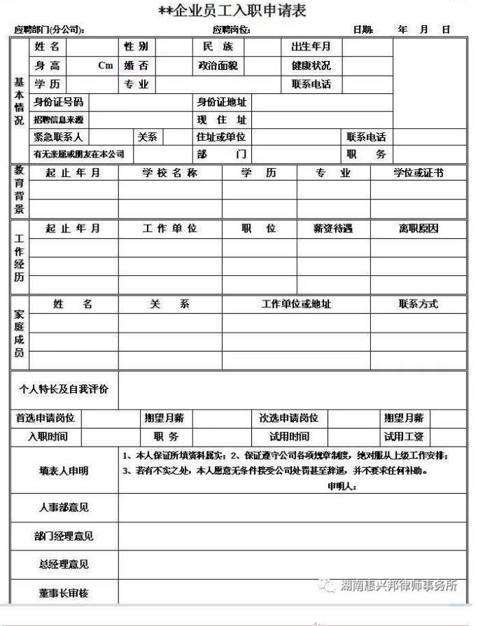 1、員工應聘入職填寫的表格一般登記的是新員工入職時的個人身份信息、教育經歷、工作經驗、家庭成員等情況的表格,目的是用人單位為了掌握員工的基本情況,并由用人單位單方保管。